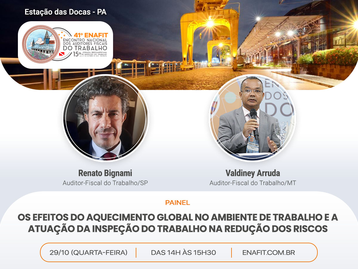 O diretor de Inspeção do Trabalho do SINAIT, Renato Bignami (SP), participará do painel Os efeitos do aquecimento global no ambiente de trabalho e a atuação da Inspeção do Trabalho na redução dos riscos, das 14h até 15h30, no dia 29 de outubro, no auditório do Hotel Princesa Louçã. O espaço de diálogo será dividido com o diretor de Prerrogativas da entidade, Valdiney de Arruda (MT). O tema integra a programação técnica do 41º Encontro Nacional dos Auditores Fiscais do Trabalho (ENAFIT), que ocorrerá de 26 a 31 de outubro, em Belém do Pará.