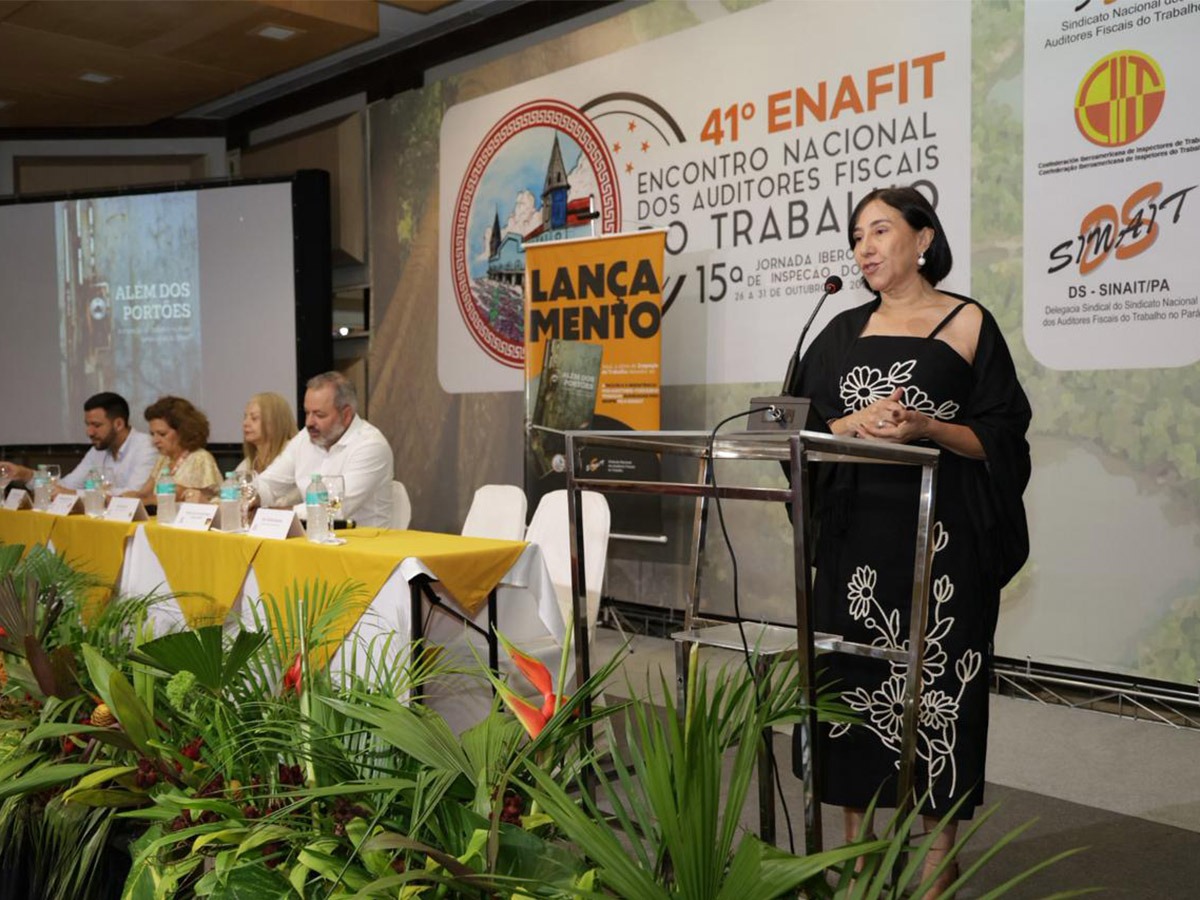 A programação técnica do 41° Encontro Nacional dos Auditores Fiscais do Trabalho (ENAFIT) nesta sexta-feira, 31 de outubro, iniciou com o lançamento do livro do SINAIT “Além dos Portões — A Inspeção do Trabalho no Brasil pelos olhos do SINAIT”, escrito pela jornalista Cláudia Machado. A obra é a primeira a narrar a trajetória da Inspeção do Trabalho sob a perspectiva do sindicato, reunindo memória, marcos institucionais, lutas e o papel da organização coletiva na consolidação da carreira. “Queríamos contar a história da Inspeção do Trabalho na visão do nosso Sindicato Nacional, que lutou muito para ajudar a construí-la”, disse a diretora do Sindicato, Rosa Maria Campos Jorge, que coordenou o lançamento.