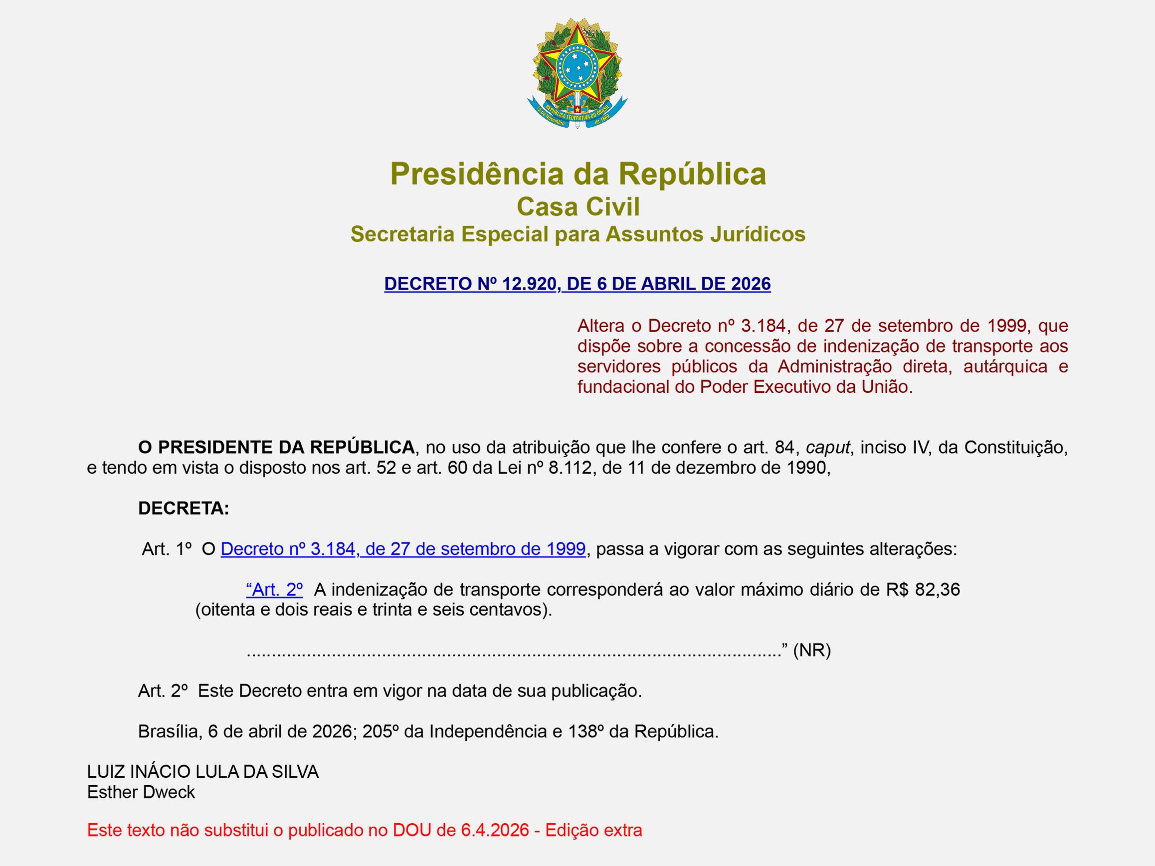 O governo federal publicou o Decreto 12.920/26, que atualiza o valor da indenização de transporte destinada aos Auditores Fiscais do Trabalho e demais servidores públicos do Poder Executivo Federal. O teto máximo diário do benefício foi elevado de R$ 17 para R$ 82,36. A medida representa mais de 20 anos de atuação do SINAIT e de entidades parceiras que defenderam esta pauta.