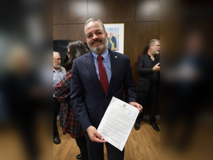 O presidente do SINAIT, Bob Machado, e o conselheiro do Conselho Fiscal da entidade Alex Myller participaram do Ato de Assinatura do Termo de Compromisso nº 01/2025 com o Ministério da Gestão e da Inovação em Serviços Públicos (MGI). O termo garante o reajuste de três benefícios: auxílio-alimentação, auxílio pré-escolar e assistência à saúde complementar. A cerimônia ocorreu na manhã desta quinta-feira, 6 de outubro, na sala de reunião do MGI, na Esplanada dos Ministérios, em Brasília.